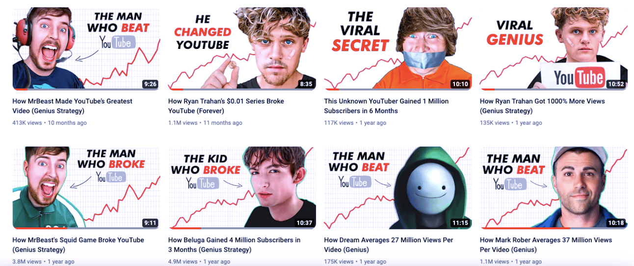 You might have noticed that there are multiple videos featuring Mr Beast. Why is that? Well, Paddy is using a tried-and-true strategy that many top Twitter creators also use. He repurposes old content that performed well and puts a unique spin on it. In this case, he targeted specific videos like 'How Mr Beast's Squid Game Broke YouTube' and 'How Mr Beast Made YouTube's Greatest Video.'