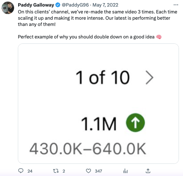 The interesting thing is that Paddy applies this same strategy for his clients too. He knows the power of leveraging successful content and tailoring it to different topics or niches to maximize reach and engagement. It's a smart approach that helps him deliver results for his clients.