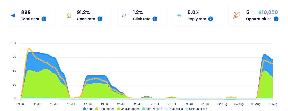 Last month, I sent out a total of 889 emails for Outforce, and guess what? Almost 91.2% of those emails got opened – that's a pretty big deal! And you know what's cool? Many of these leads came from trying out leads from Growthlists, Cyberleads, and SaasyDB. (which is why i felt it was only right to make a case study on this)