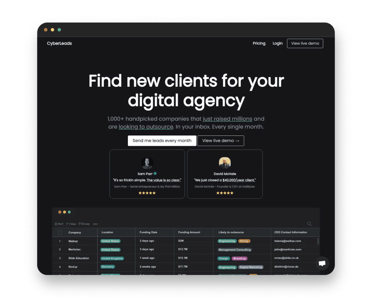 Cyberleads is a lead generation service for digital agencies. They hook you up with leads lists of 1,000+ companies that recently scored big funding and need outsourcing.