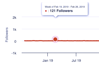 A year before the launch, during the period of Feb 19 - Feb 26 2019, Alex gained 121 new followers. This was his first spike of 100+ followers in a week.