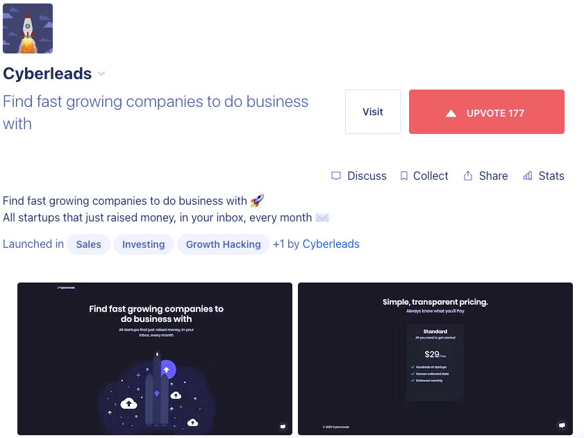 February 14th, 2020: Alex launched Cyberleads on a website called Product Hunt. If you didn’t know, Product Hunt is site is all about showing off new products people have made. You submit your creation, and list it for everyone to see. People can comment on it and vote for it, sort of like Reddit or Hacker News.