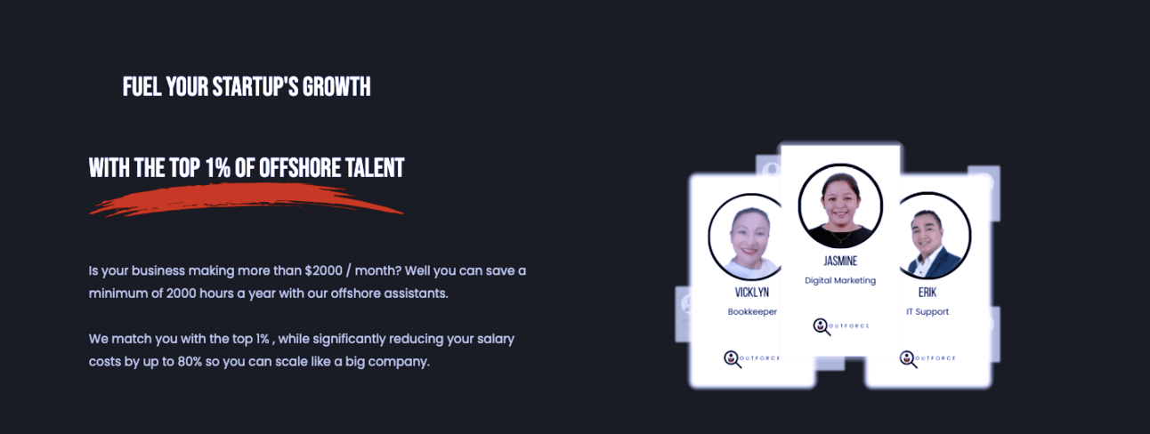 My team at Outforce has a proven track record of helping clients build their startups with world class growth assistants that costs 80% less than a typical US hire.