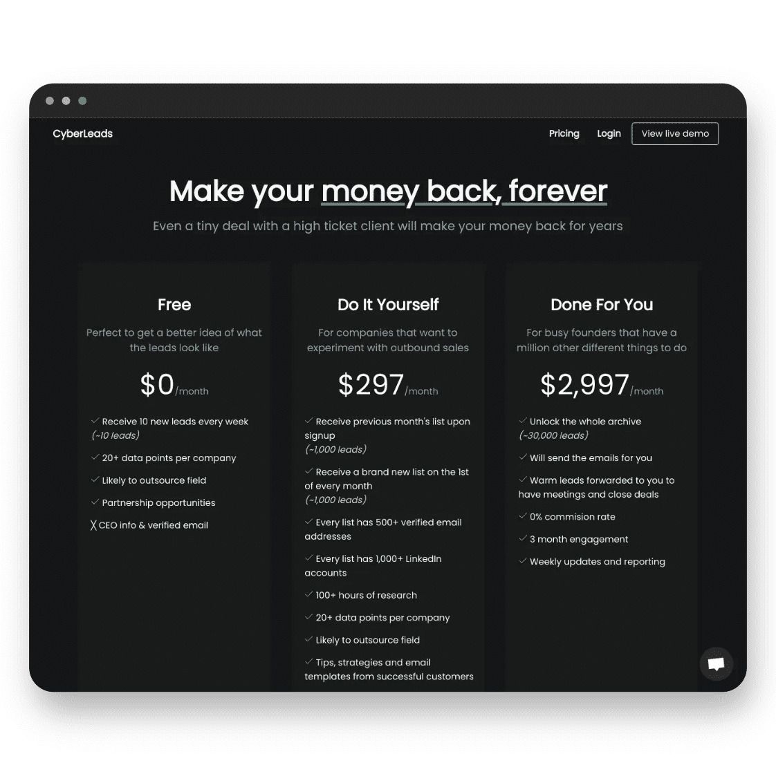 Done For You Plan: For $2,997 per month, you unlock 30,000 leads. Cyberleads will warm up your leads, set up your meetings, and provide weekly updates – pretty much the whole package.