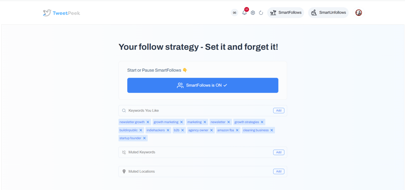 Automated Growth: TweetPeek then follows 50 users a day in this niche who are likely to follow you back, and it gives them 24 hours to follow you back.